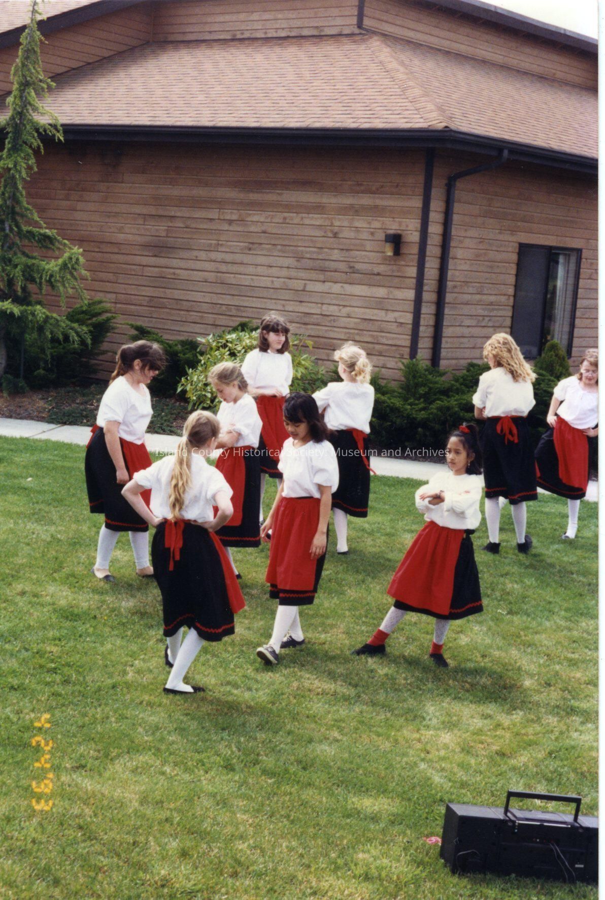 Color photo of a group of girls in white shirts and stockings, red aprons and dark skirts. They are dancing holding hands in two groups of four and one group of two. A tape player is on the ground in the lower right corner. Dated Apr 23, 1993