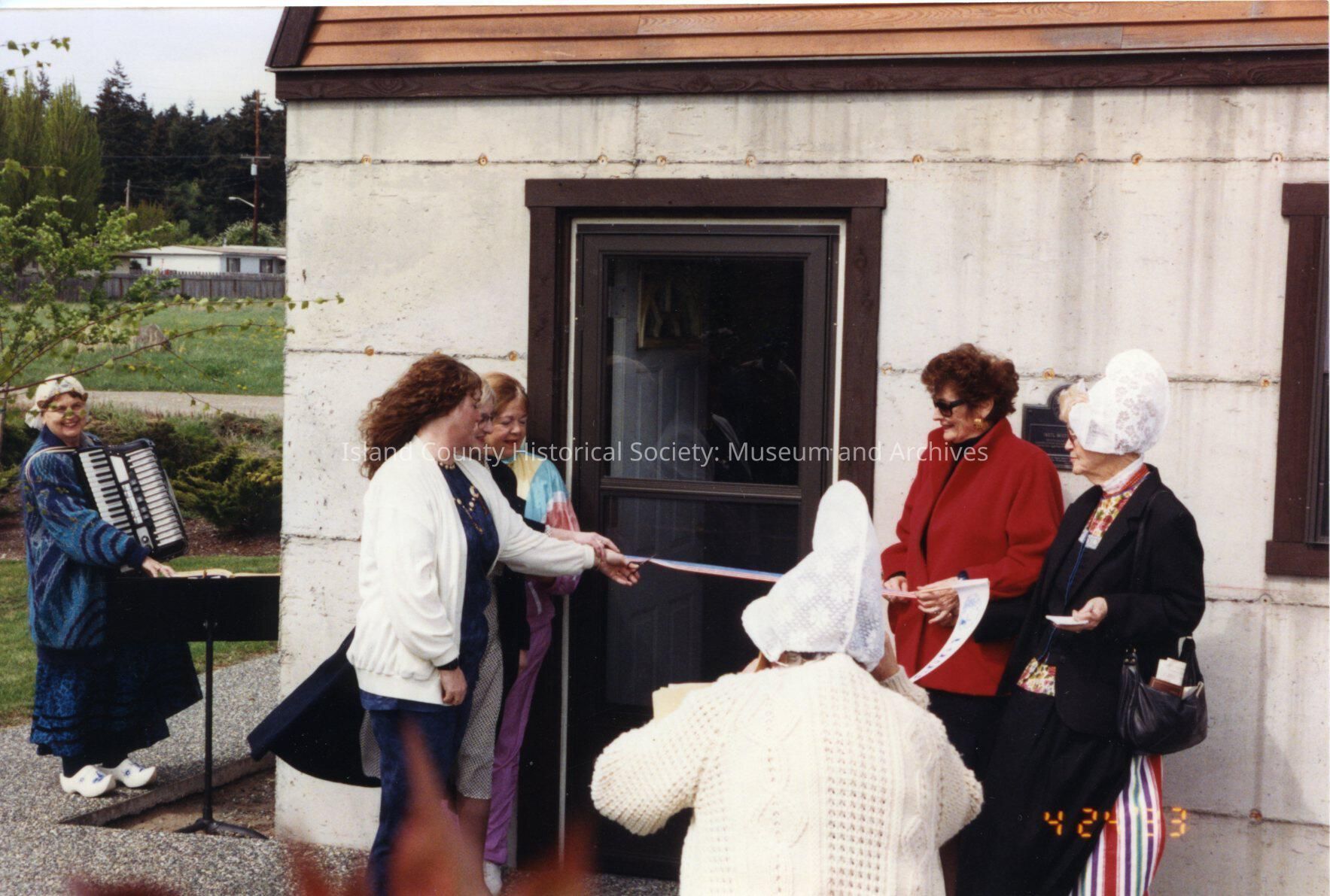 People outside a historic building, Neil Water Tower. Several dressed as Dutch people. Handwritten on back are these names: Dee H., Orren Ward's daughter, Toby Ward Johnson, Jan Ellis, Dorothy Neil, Helen C-weeks.