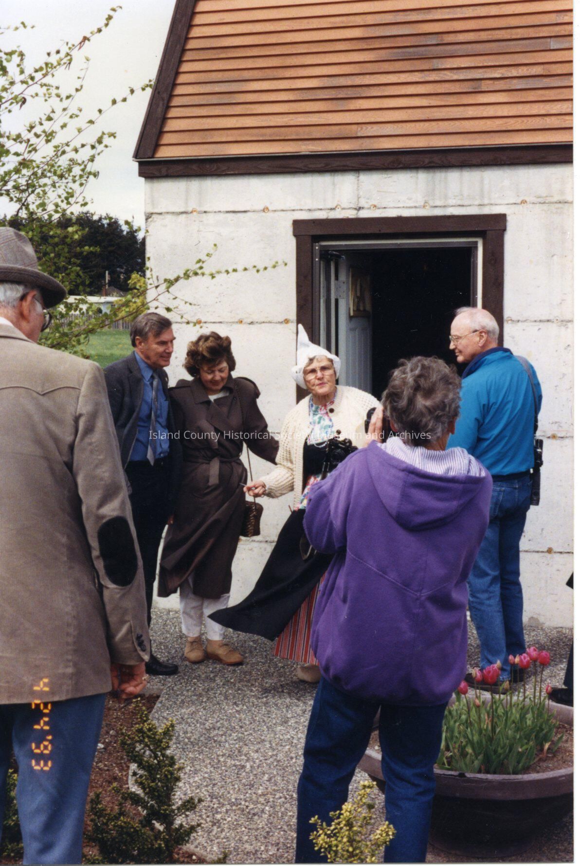 People outside a historic building, Neil Water Tower. Several dressed as Dutch people. Handwritten on back - City Supervisor Pat Nevins and Wife, County Auditor Chuck Arnold, Hugh Brainerd, Grace Horn, Chuck Arnold.
