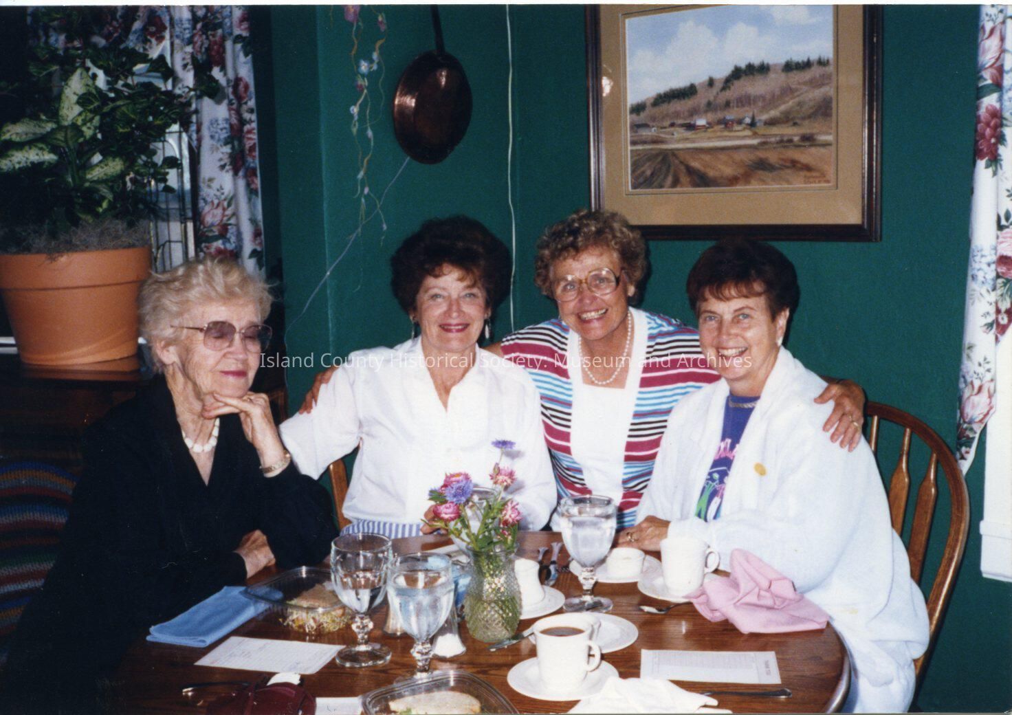 Color photo of a group of four women seated at a table with glasses, flowers, coffee cups and plates. The woman on the left is wearing a dark dress with white necklace. The woman to her right is wearing a white top/dress, the woman in the center is wearing a red, white and blue side-ways striped top, the woman on the right is wearing a blue shirt with white jacket. The wall in back is green. A copper pan/skillet is hanging on the wall. A picture of a farm with a hill and trees behind is on the wall. A large potted plant is on the left.