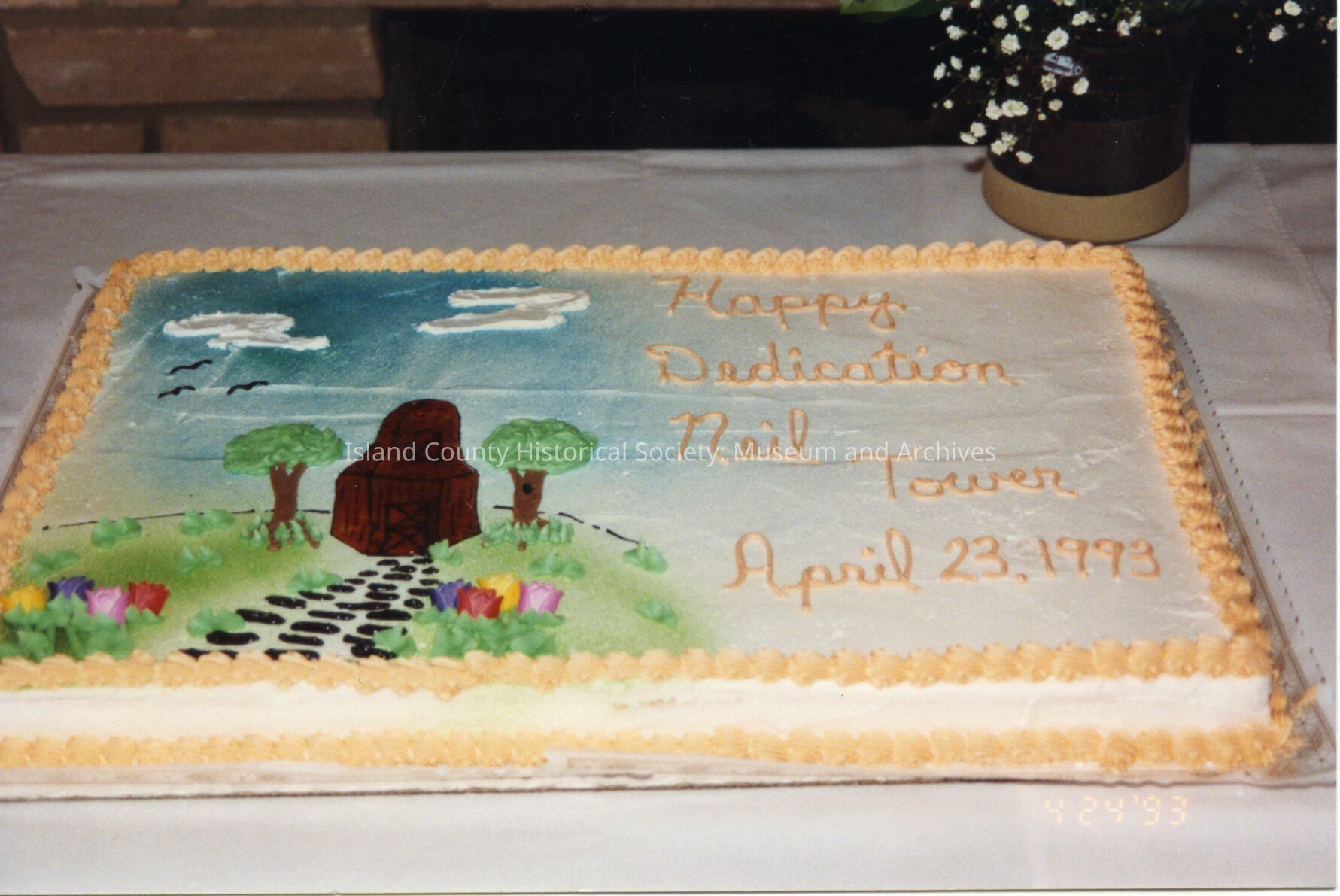 Color photo of a large sheet cake with a white icing, yellow bands around the top and lower edges, sky, a few clouds and birds, flowers, two trees, a path and a building. Yellow icing letters: Happy Dedication Neil Tower, April 23, 1993. The cake is on a table with white tablecloth and a pot with flowers at the top right.