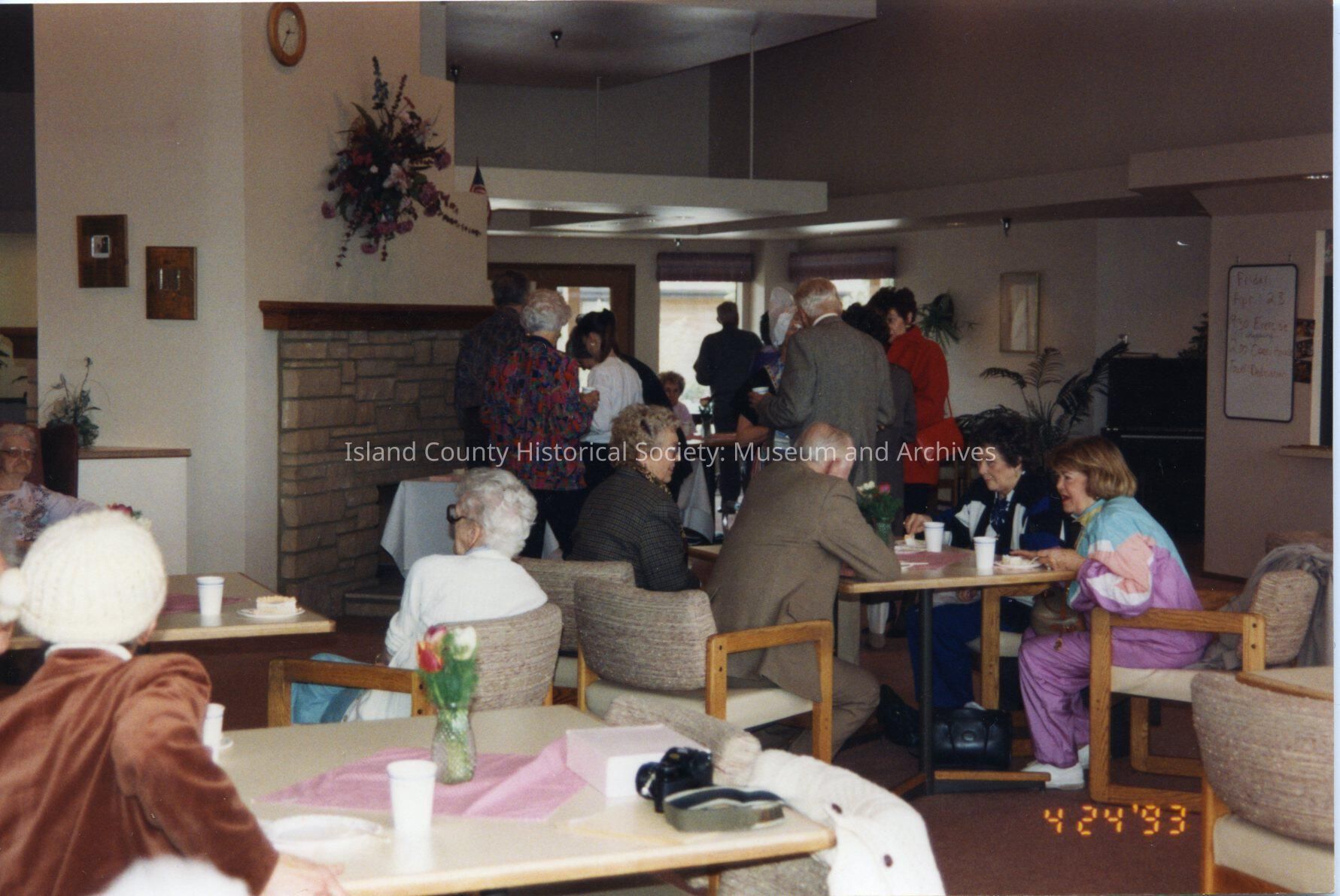 People inside a cafe, sitting at tables. Handwritten on back are these names: Dutch Hat Helen and Frank Kelly, Marie and Charlie Reiskorf, Margarete Walsh, Dee Herbeur.