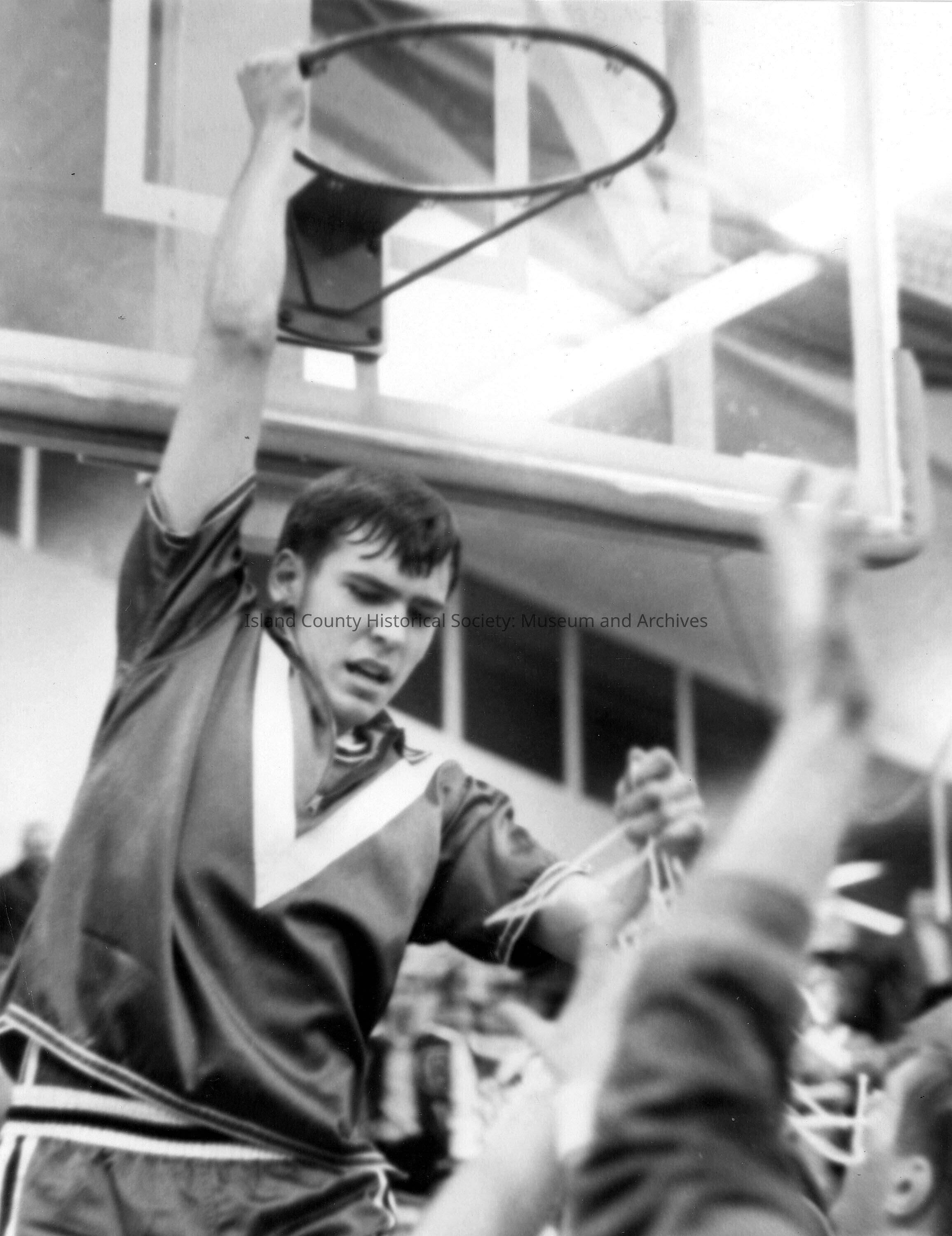 Basketball player removing net from hoop.