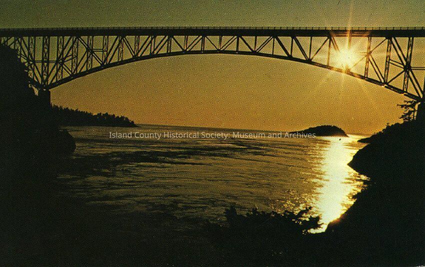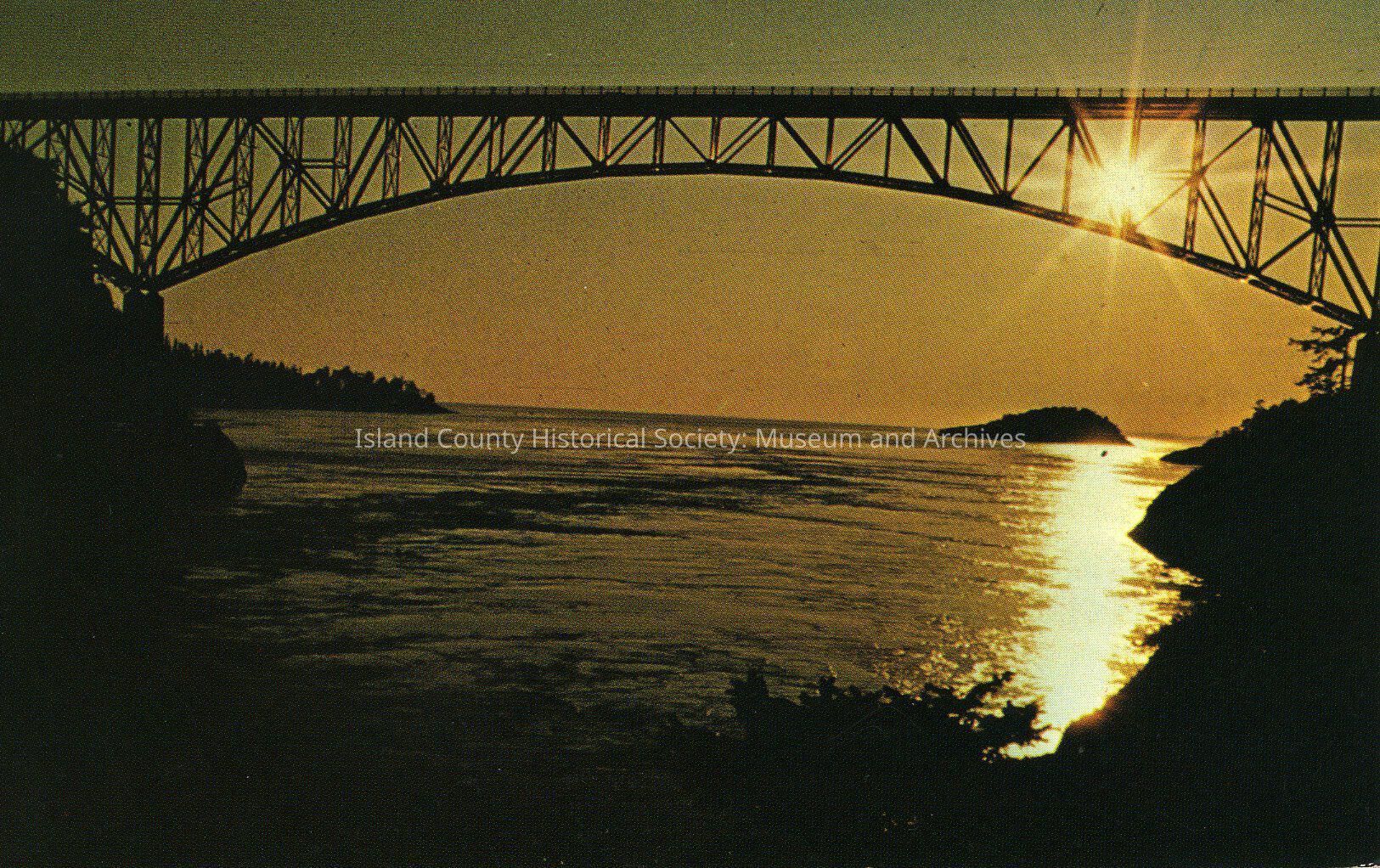 The color postcard shows a view of the Deception Pass bridge. The photo shows a silhouetted bridge with the water calm and the sun poking through one of the bars of the bridge. The sun left a stream of light on the right side of the photograph.Dimensions