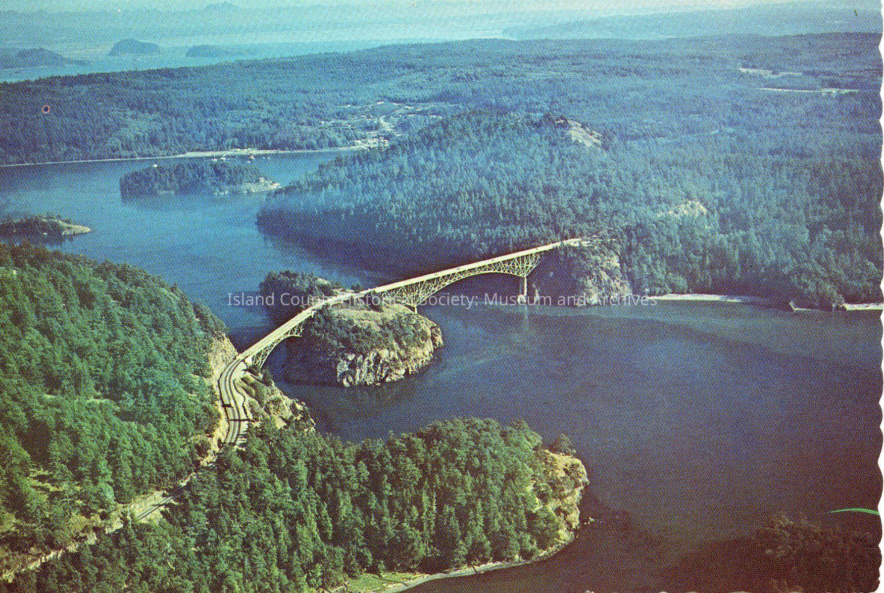 The photo is an aerial view of Deception Pass Bridge and Canoe Bridge. You can see Whidbey Island on the Right, Pass Island in the center of the photo and Fildalgo Island on the left. Whidbey and Fildalgo Island are both covered in trees. You can also see Strawberry Island in the top left of the photo and Ben Ure Island to the right of Strawberry Island.Relationships