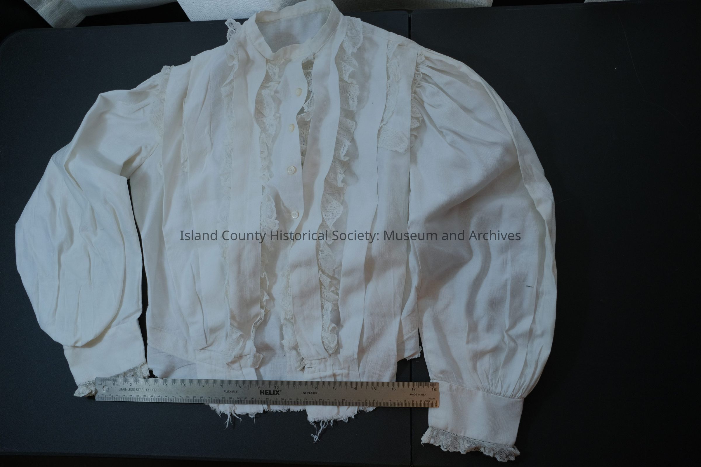 white damask linen, long sleeves, lace trim, machine-sewn, but hand-worked button holesCollection