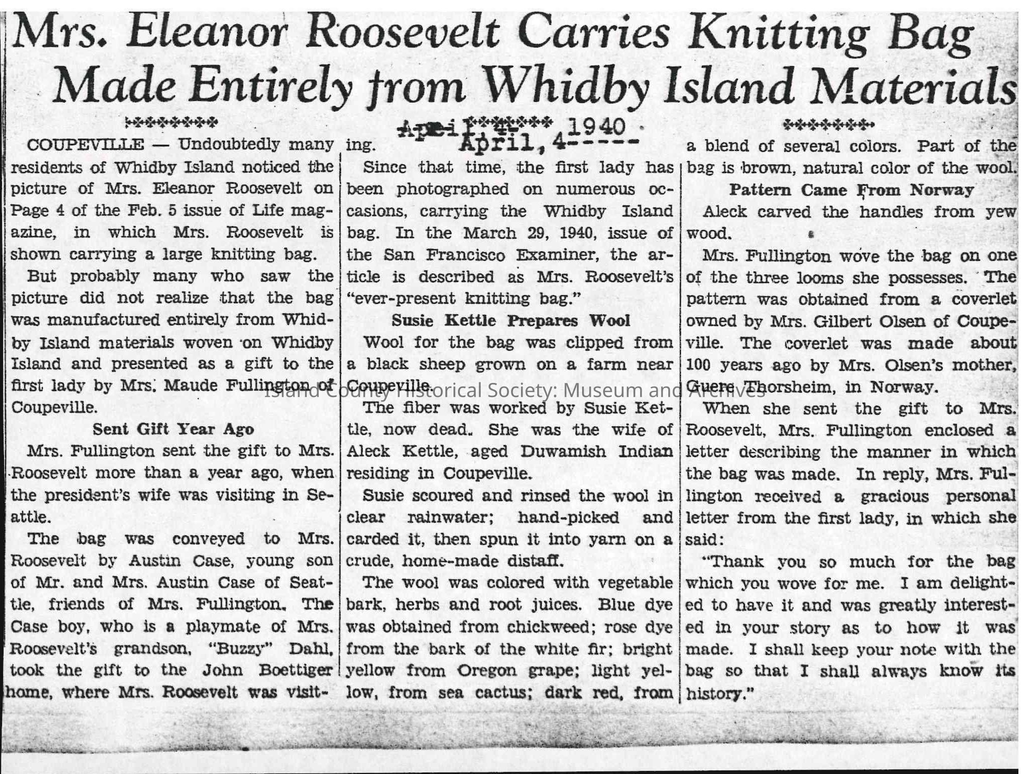 Portion of an article regarding the woven bag made by Maude Swift Fullington, Susie Kettle, and Aleck Kettle, gifted to 32nd First Lady Eleanor Roosevelt.