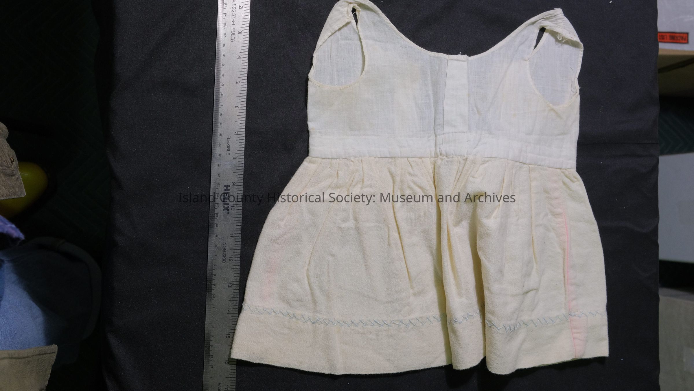 White petticoat with sack top & flannel skirt w/ blue cross-stitch.
