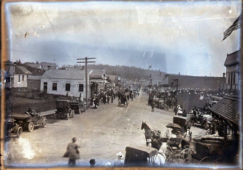 People in cars (Model Ts?) and in horse drawn carriages line an unpaved town thoroughfare. Phone lines visible on the left; American flag in upper right corner and another flag visible in the background on the right. A tree-covered hill visible in the background. Buildings appear on both sides of the street. Not sure what event is taking place, as there is no clear parade passing through the street.Collection
