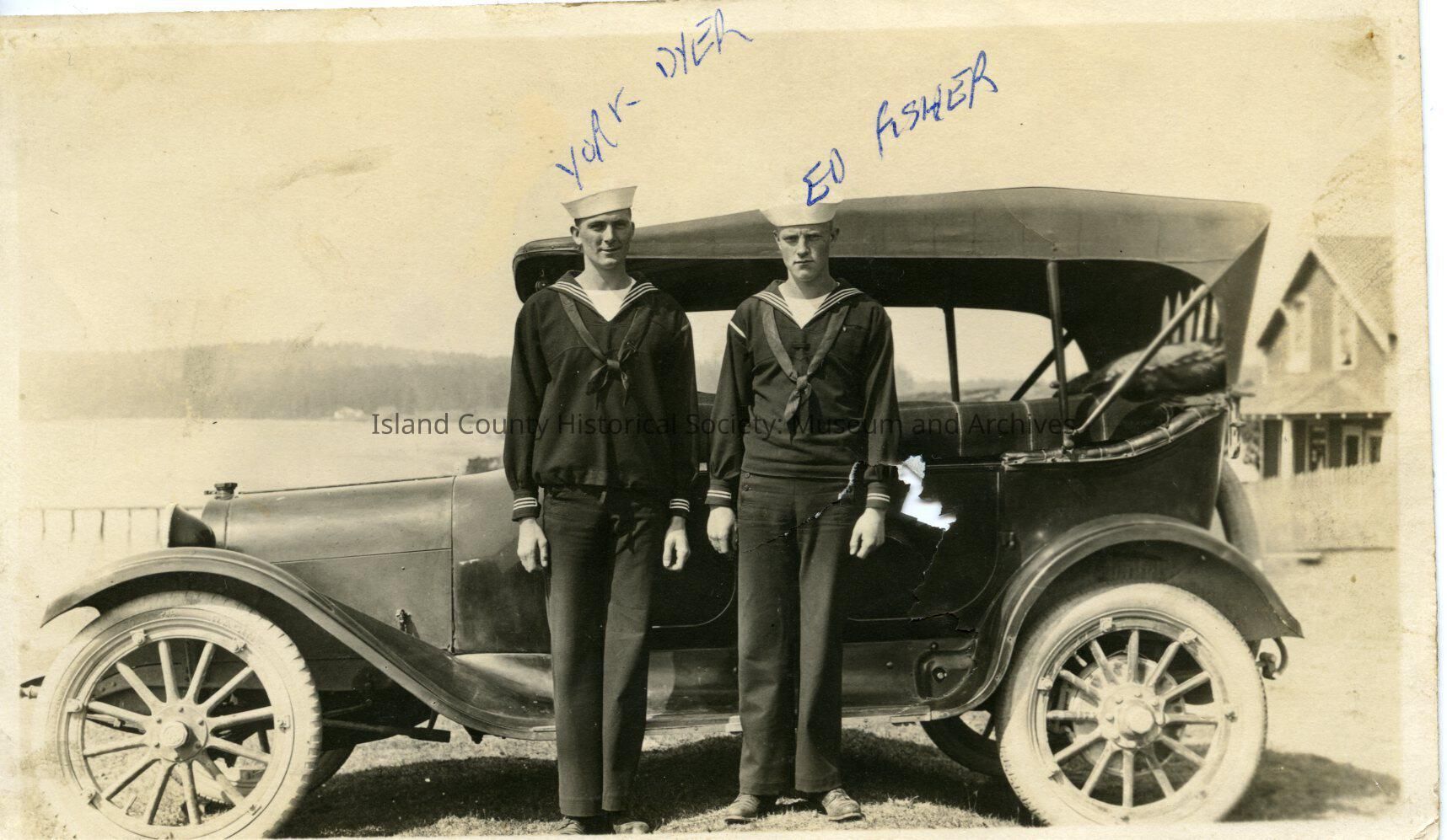 Black and white photograph of two sailors standing beside an old four-door car. House in the background. The men are wearing sailor uniforms. Over their heads is written: on the left: York Dyer, the man on the right Ed Fisher.