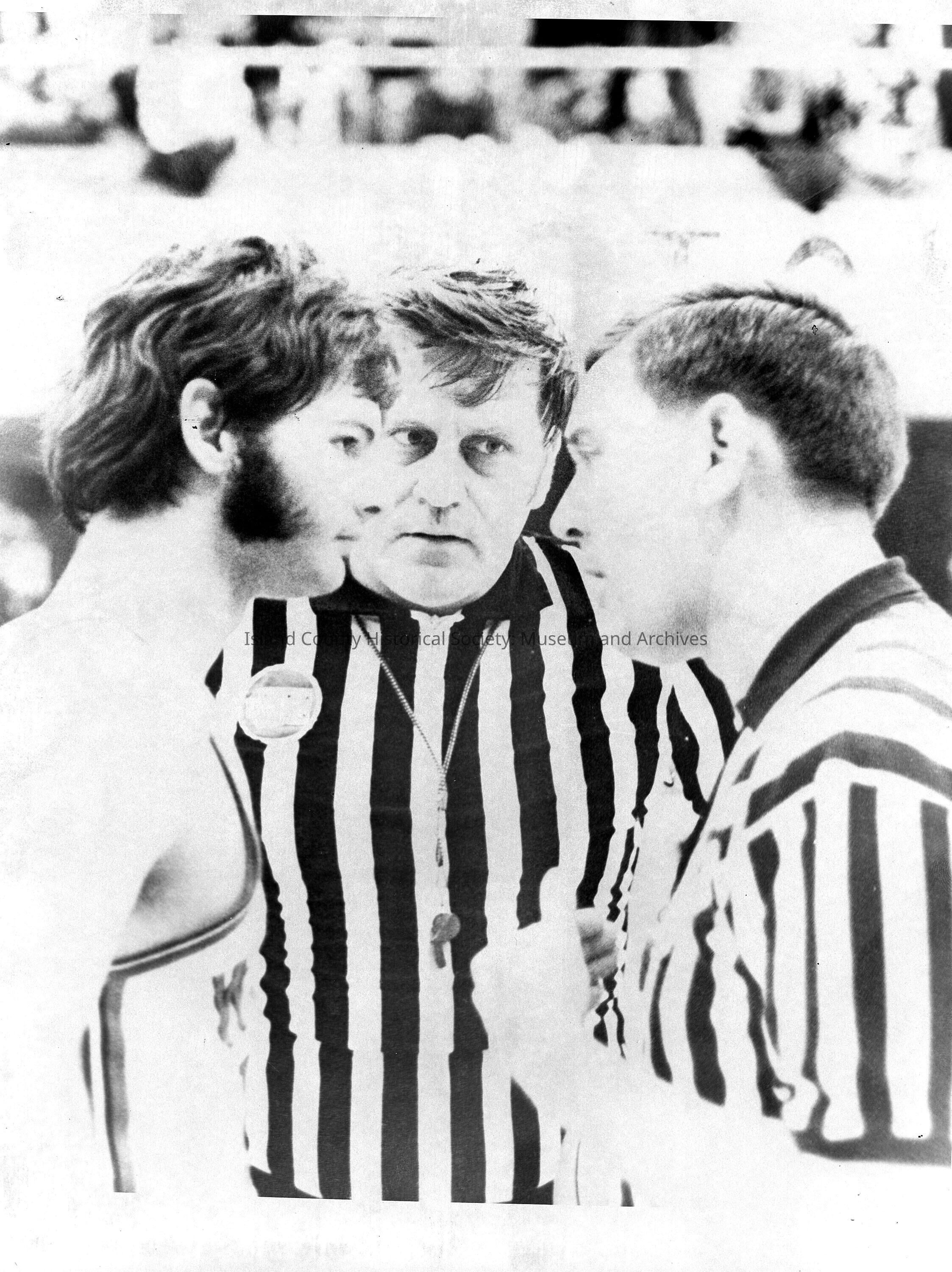 Player Randy Duggan talking to Referee Frank Ogleswie (center) and Ray Christopherson