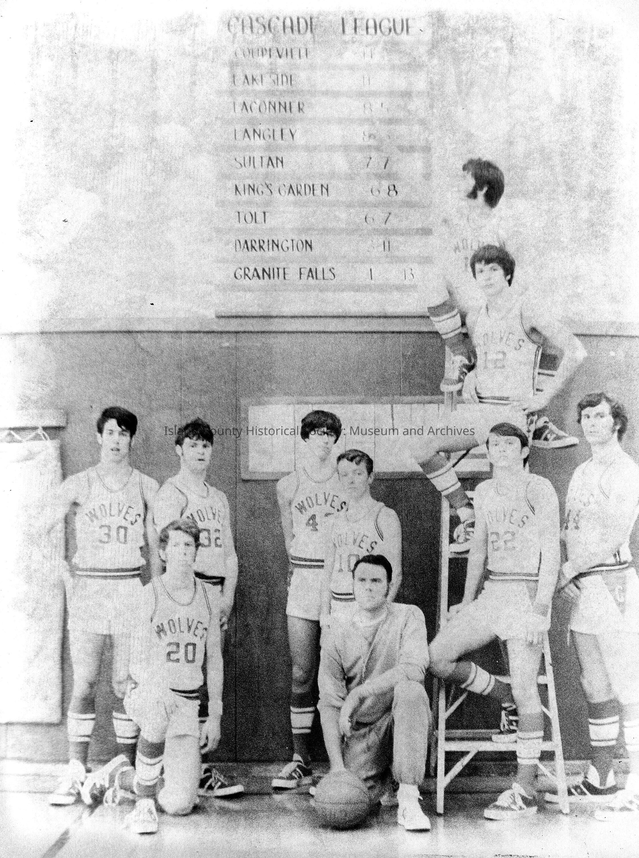 Coupeville Basketball team with Coach Bob Barker kneeling in front. Top of ladder Randy Duggan, Cory Cross middle of ladder, Kevin Ferris foot of ladder. Jeff Stone kneeling in front. Keith Jamison standing behind coach Barker. Number 30 Bill Riley. Other players unknown.Collection