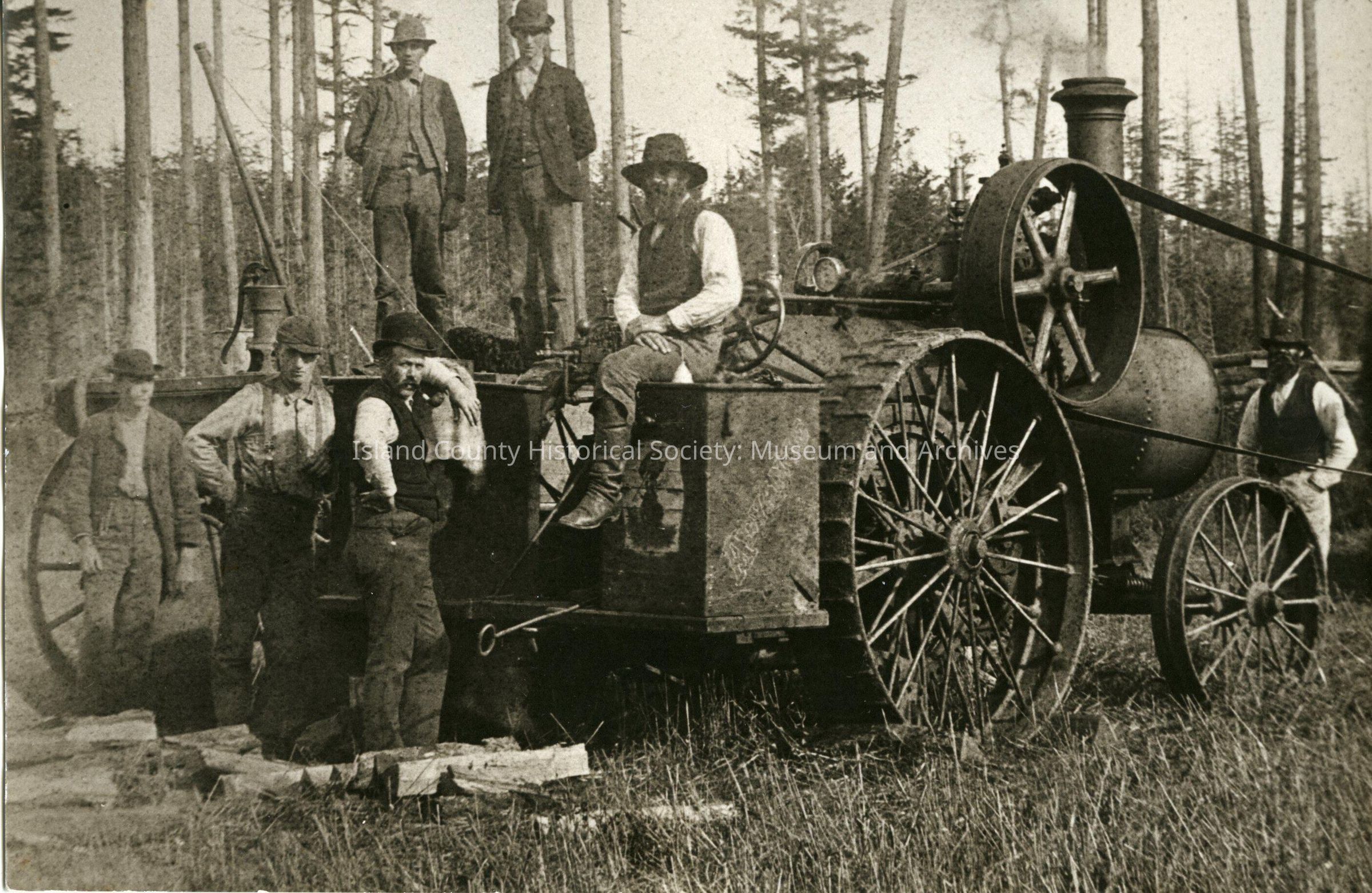 Black and white photograph of a group of men/farm workers sitting, standing on or beside a farm engine/vehicle. The men are in jackets, vests, trousers, hats. Some have beards. Vehicle has large wheels - two in front smaller - and a wheel with a belt attached to something off the picture. It is steam powered - steam out of the chimney in front. On the back: farming on Maylor's farm. Now has officer housing area.Made/Created