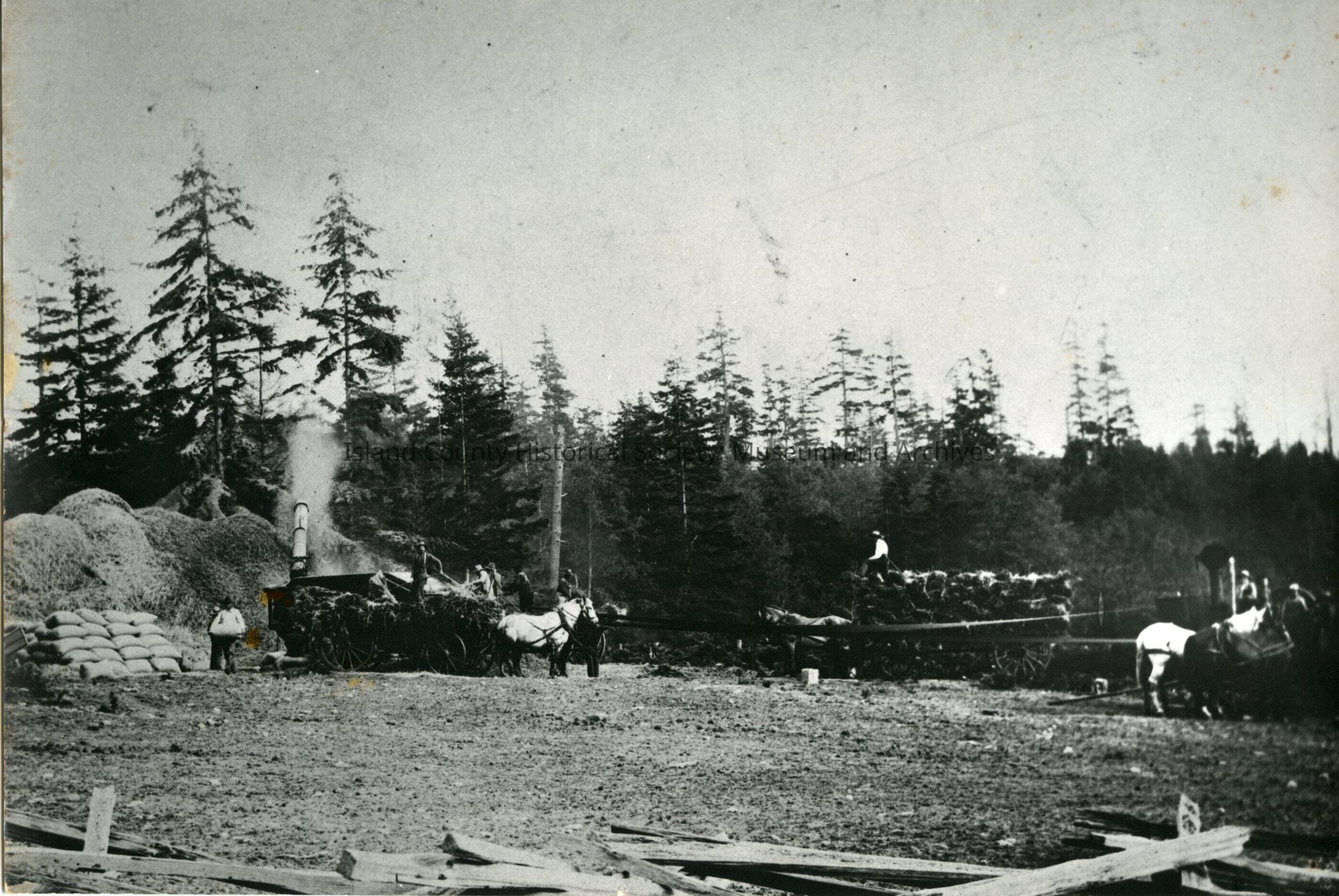 Black and white photograph of a group of men/farm workers working with haying equipment. One is spewing hay onto a huge pile. The vehicles are horse-pulled wagons and maybe an engine. Bags of hay or something else are on the ground on the left. Hay wagons. On the back: Old Maylor farm on Seaplane Base (now O. housing).