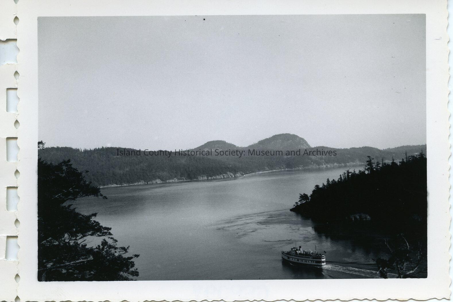 The black and white photo shows a ferry boat traveling across Puget Sound. The ferry boat is entering the picture in the bottom right hand corner. Next to the ferry is an island covered in trees.