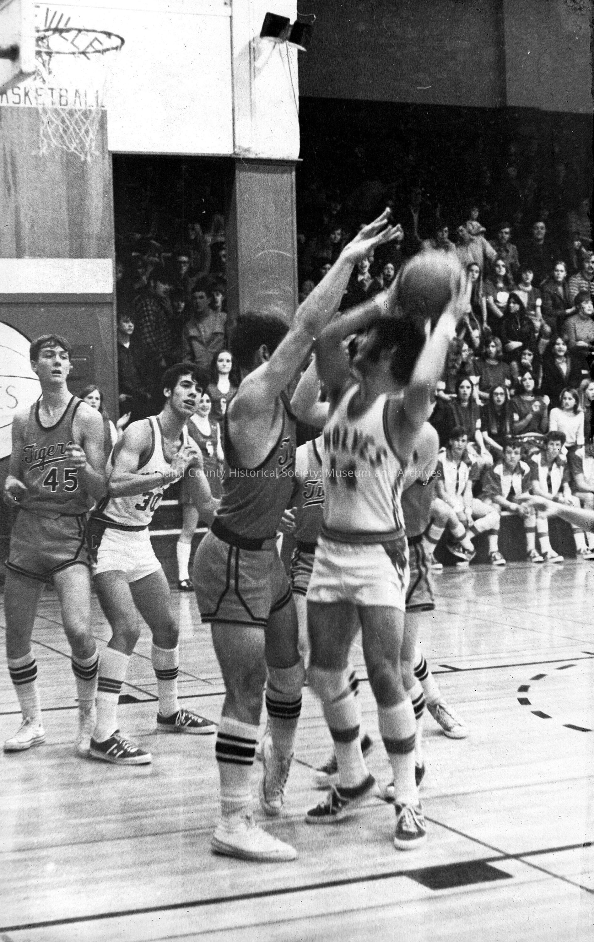 Basketball game with Randy Duggan holding ball and looking at Bill Riley.