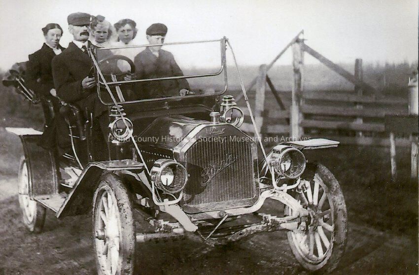 The black and white photo shows a close up of a man driving an automobile with three children (two girls and one boy) and one woman in the backseats. Behind the car shows a fence with two posts sticking out of the ground. Driver: Jacob Logterman, Front Passenger: Edward Logterman,