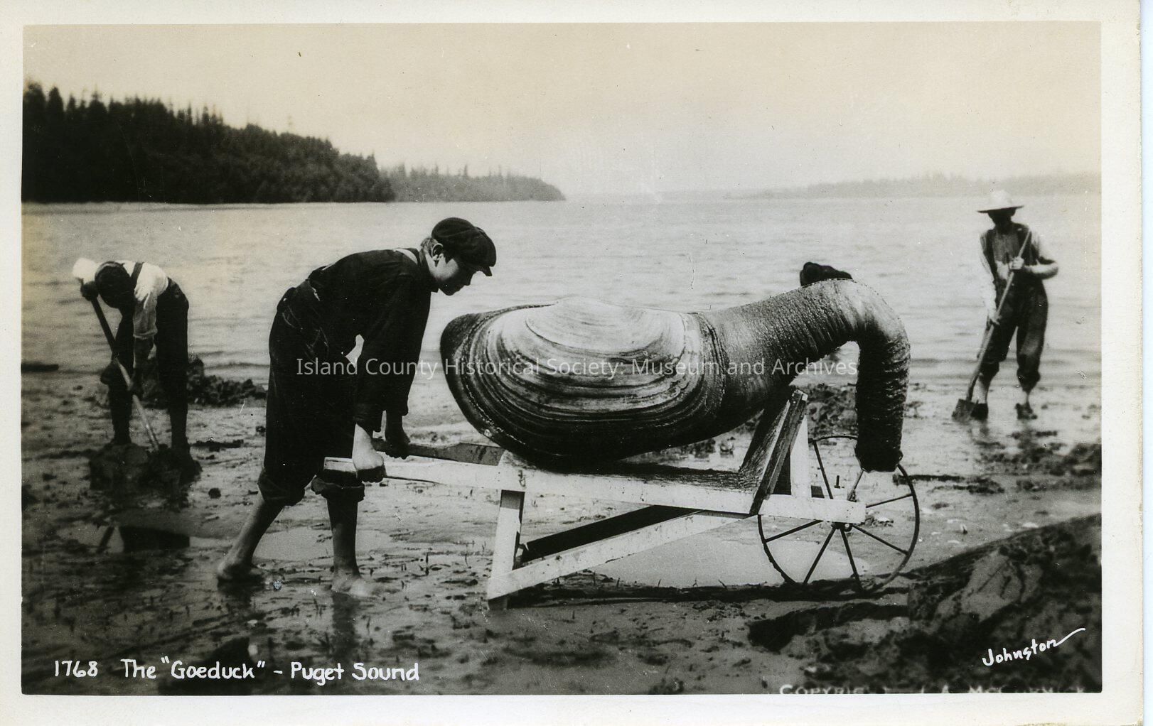 The black and white photo shows three workers in mud. The one on the left and right are shoveling the mud, and the one in the middle is about to push up a wheelbarrow. Caption: the "goeduck" - Puget Sound.