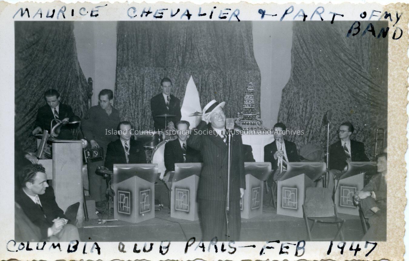 Black and white photograph of a band seated at box-like music stands (each stand has letters PA - probably for Paul Allen), and a singer in front wearing a straw hat with ribbon at the base of the crown. Across the top: Maurice Chevalier and part of my band. On the bottom: Columbia Club Paris - Feb 1947. On the back: Paul Allen to left behind arm of singer.