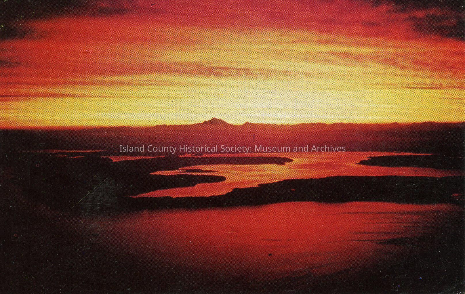 The color postcard shows Whidbey Island at sunrise with Mt. Baker on the horizon.Dimensions