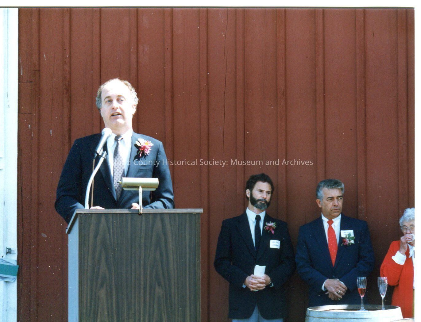 Opening of Ste Michelle Loganberry Liqueur production at Greenbank Farm in 1987. Three men and one woman near podium outside barn. One man speaks at podium while others stand near barn wall. Digital copy of Kawasaki photo.