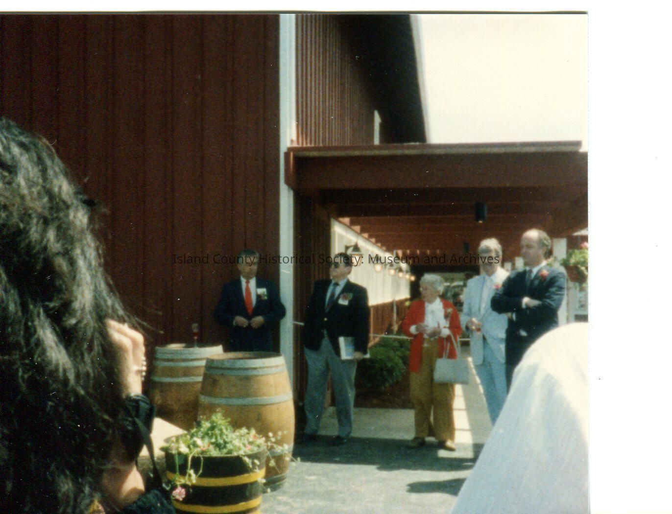 Opening of Ste Michelle Loganberry Liqueur production at Greenbank Farm in 1987. Four men and one woman outside barn near walkway. They appear to be listening to a speaker. Digital copy of Kawasaki photo.