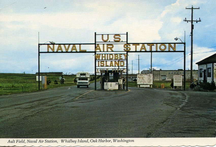 The color postcard shows the entrance to the U.S. Naval Air Station. On the left there is a recreational vehicle exiting the air station, there are many telephone poles along the right side of the road, the left shows a grassy field.Dimensions