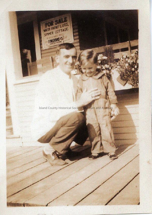 The black and white photo shows Homer Jones and his son Donald in front of the Freeland store. Behind them is a for sale sign for water front lots and summer cottages. Next to Donald are flowers.