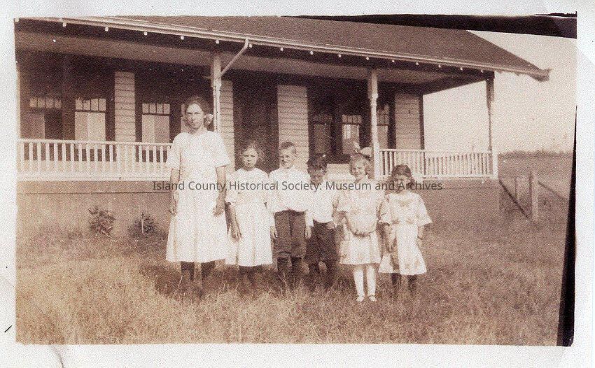 The black and white photo shows six children in front of a house. There are four girls and two boys, the two boys are standing in the middle of the girls.