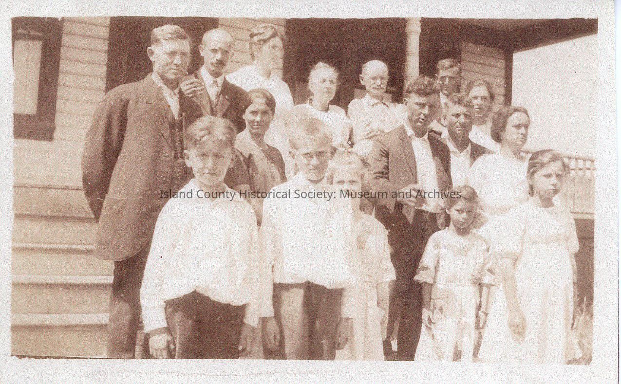 The black and white photo shows the Jones and Zettle Family Reunion. There are five children standing in front of eleven adults. On the left of the photo is a small glimpse of the porch steps.