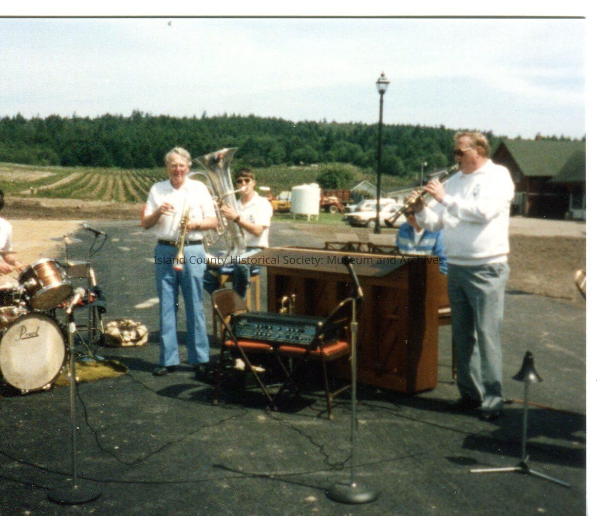 Opening of Ste Michelle Loganberry Liqueur production at Greenbank Farm in 1987. Band (piano, clarinet, trumpet, tuba, drums) in parking lot. Car, barns and loganberry bushes in background. Digital copy of Kawasaki photo.Lexicon