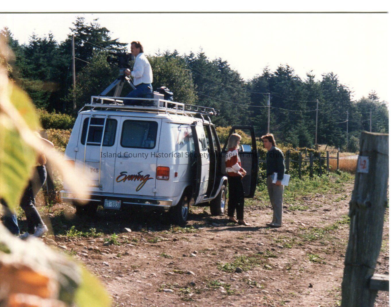 Opening of Ste Michelle Loganberry Liqueur production at Greenbank Farm in 1987. KING 5 Evening Magazine van in loganberry field. TV cameraman shoots from roof of van while man and woman talk at front door. Digital copy of Kawasaki photo.