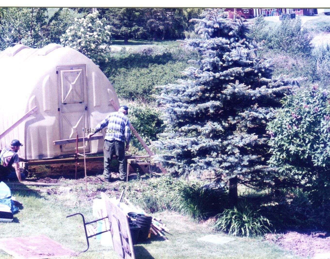 Ste Michelle Loganberry Liqueur production at Greenbank Farm. Two men work to install hothouse structure among trees. Barns are visible in background. Digital copy of Kawasaki photo.