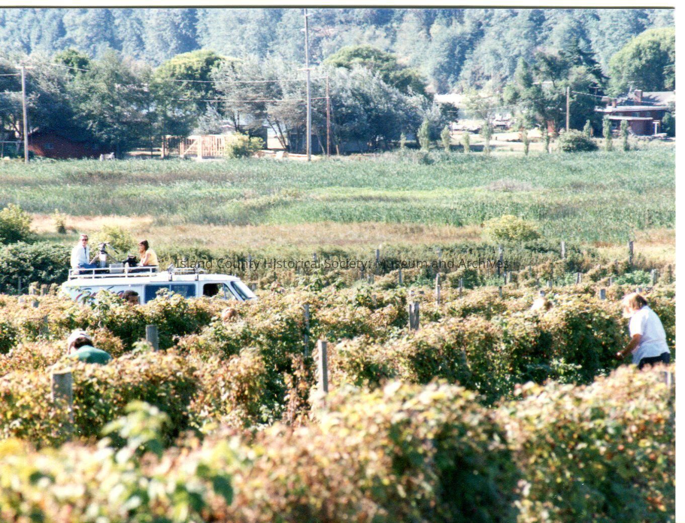 Ste Michelle Loganberry Liqueur production at Greenbank Farm in 1987. KING 5 Evening Magazine van in loganberry field. TV camera operators shoot from roof of van. Marshland and houses visibles in background. Digital copy of Kawasaki photo.