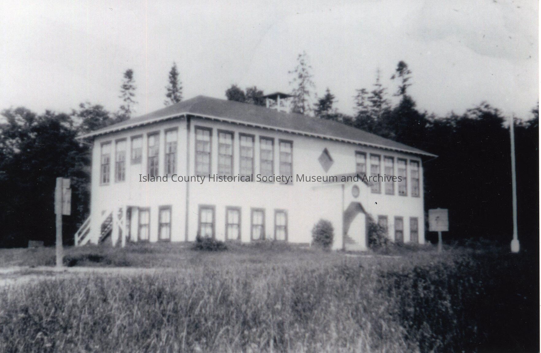 The black and white photo shows the Freeland Austen school at Mutiny Bay ca. 1925.