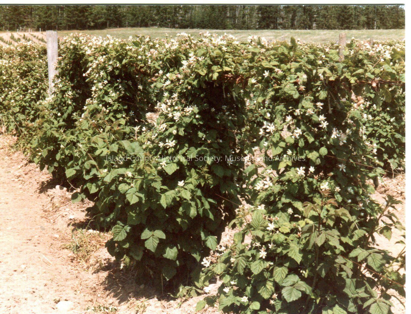 Ste Michelle Loganberry Liqueur production at Greenbank Farm. Closeup of loganberry vines blooming. Trees in background. Digital copy of Kawasaki photo.