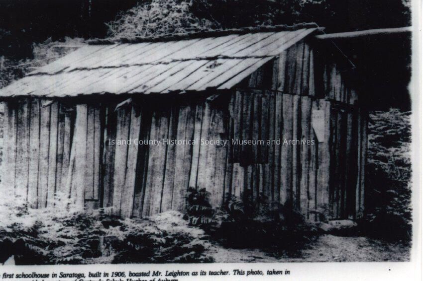 The black and white photo shows the first schoolhouse in Saratoga, which was built in 1906. The teacher at the time was Mr. Leighton. The photo was taken in 1914. The wood on the building is coming apart and there are several trees around the crumbling building.