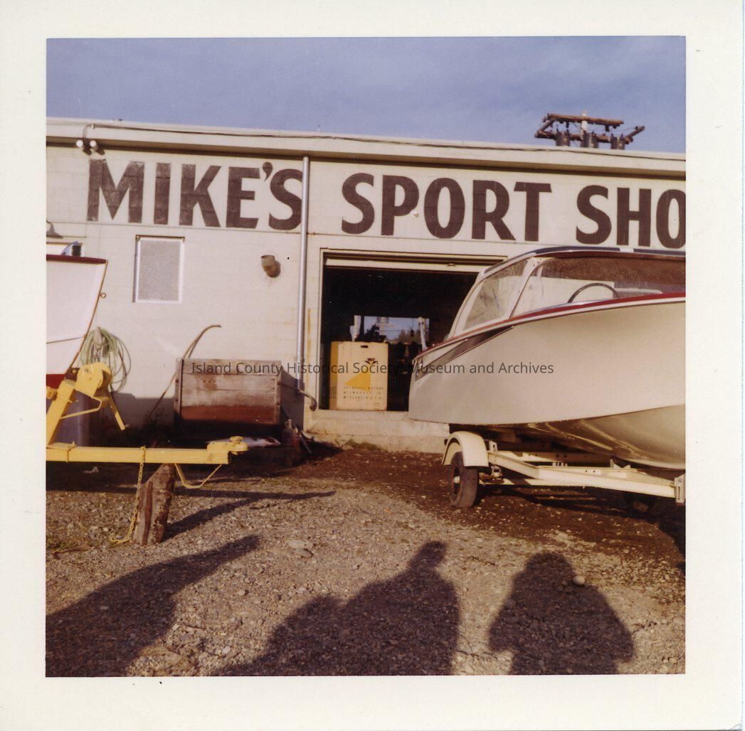 The color photograph shows Mike's Sport Shop. The side of the building has a boat coming out of the opening. There are shadows of the people in front of the boat.