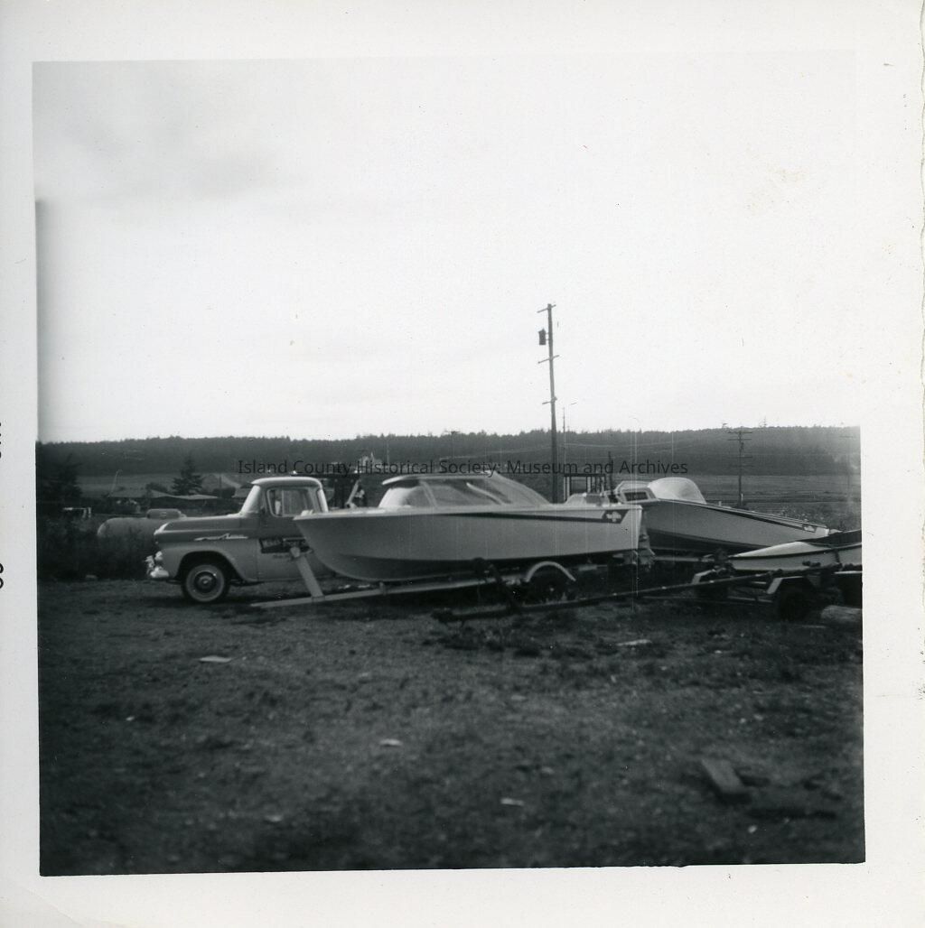 The black and white photo shows a boat that belongs to Mike's Sport Shop. Behind the boat is a telephone pole and several cars.