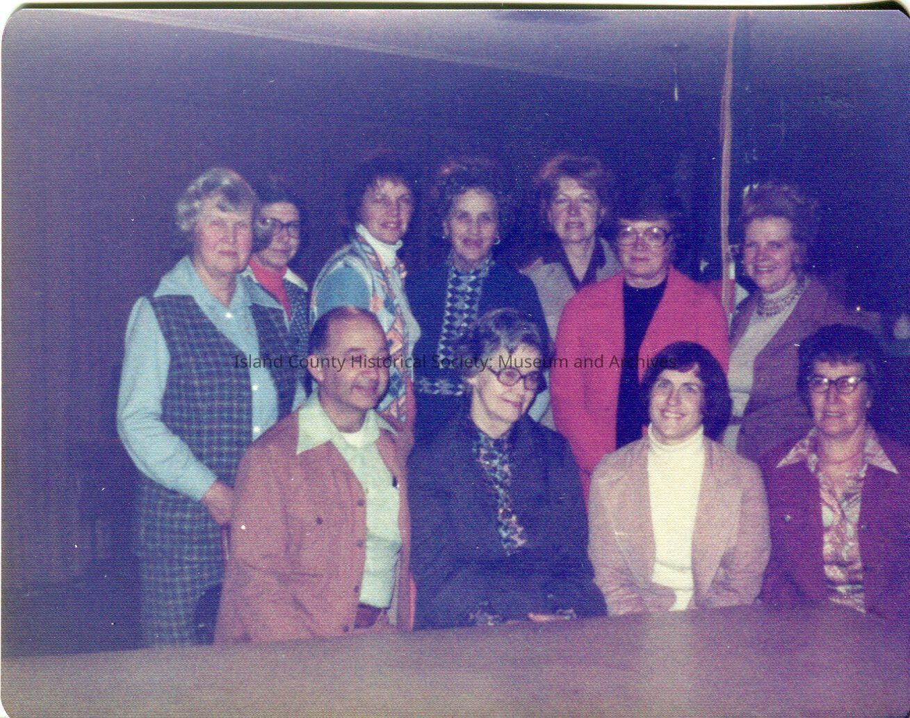 Color photograph of a group of people sitting at a table with a row of people standing behind them. From a note: the picture of the 1970 committee of the Oak Harbor Museum at their first meeting in the upstairs meeting room of the old Driftwood Restaurant in downtown O.H. are: left to right: 1st row: Hal Ramaley, Dorothy Neil, Sandy Pease, Kay Nelson