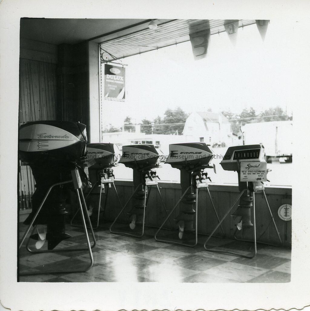 The black and white photo shows boat motors on display in front of the store window (Mike's Sport Shop).