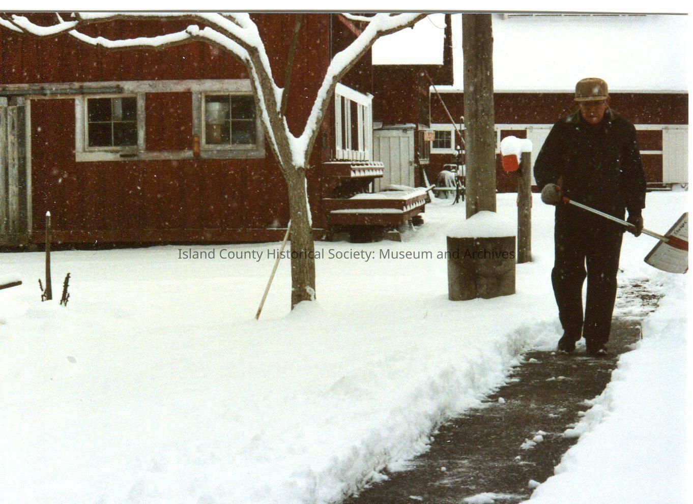 Ste Michelle Loganberry Liqueur production at Greenbank Farm. Mun Kawasaki carries snow shovel outside barn. Digital copy of Kawasaki photo.