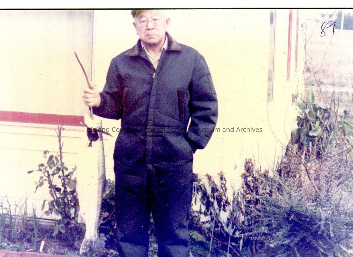 Mun Kawasaki holding salmon in front of building. 87 written on photo. Digital copy of Kawasaki photo.
