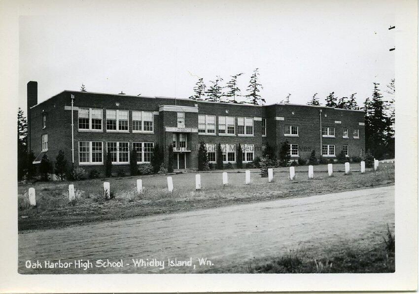 The black and white photo shows the old Oak Harbor High School. The view of the high school is in three-quarter view with white posts in the front. The school is now in use to elementary students.
