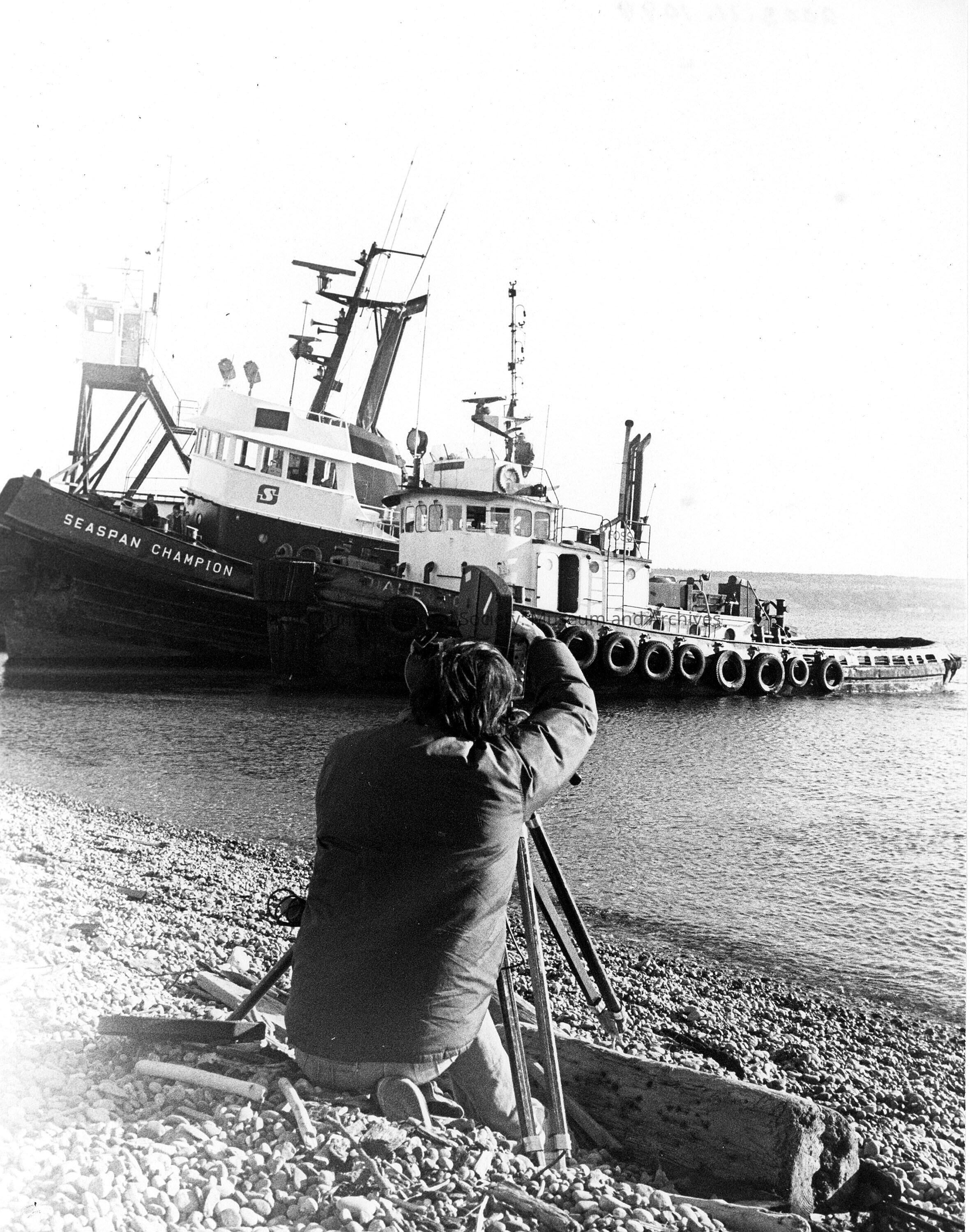 B&W photo of a photographer taking a picture of the Seaspan Champion