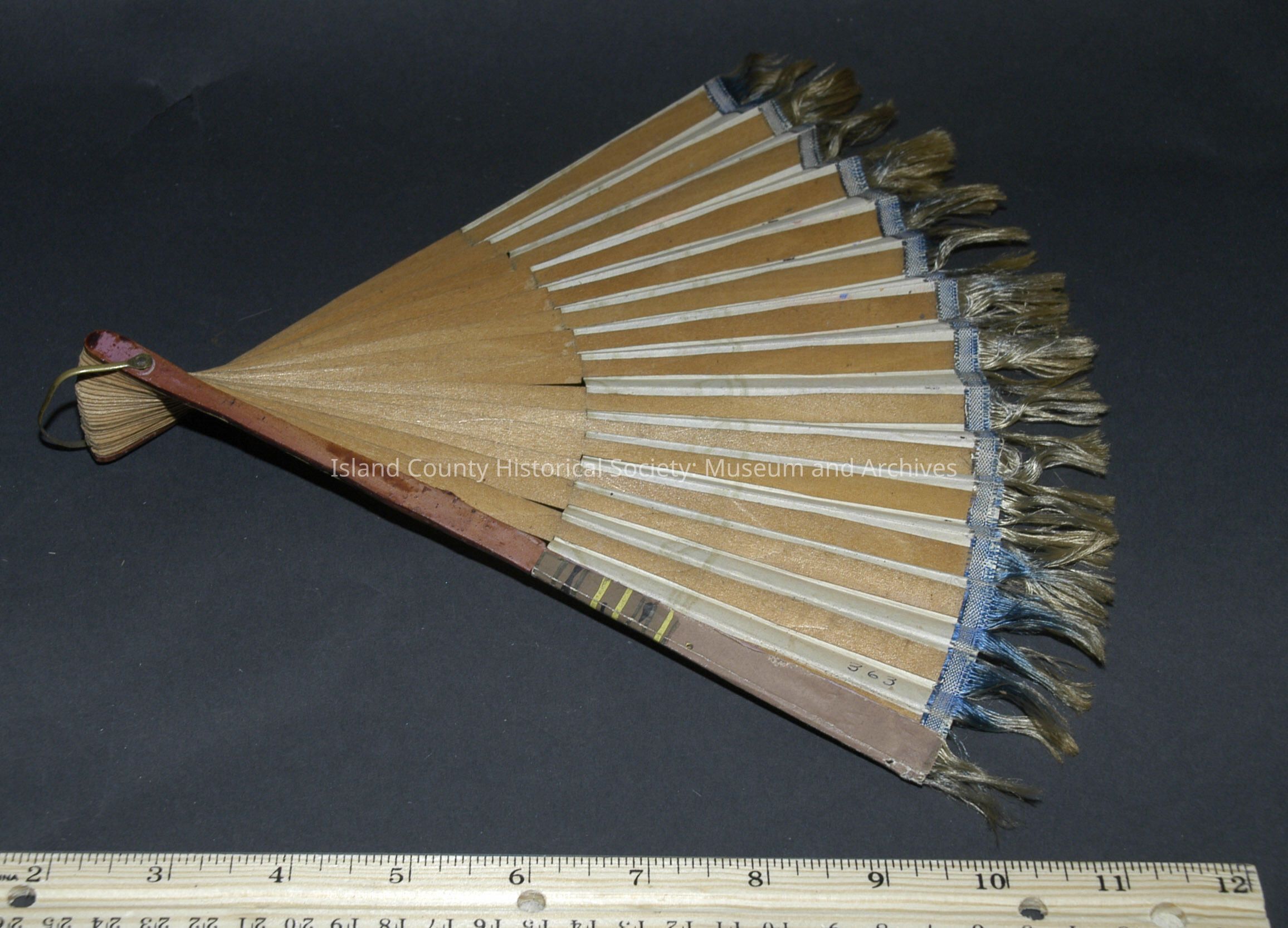 Peach and brown paper fan with blue fringe. Used by Ruby Hancock.