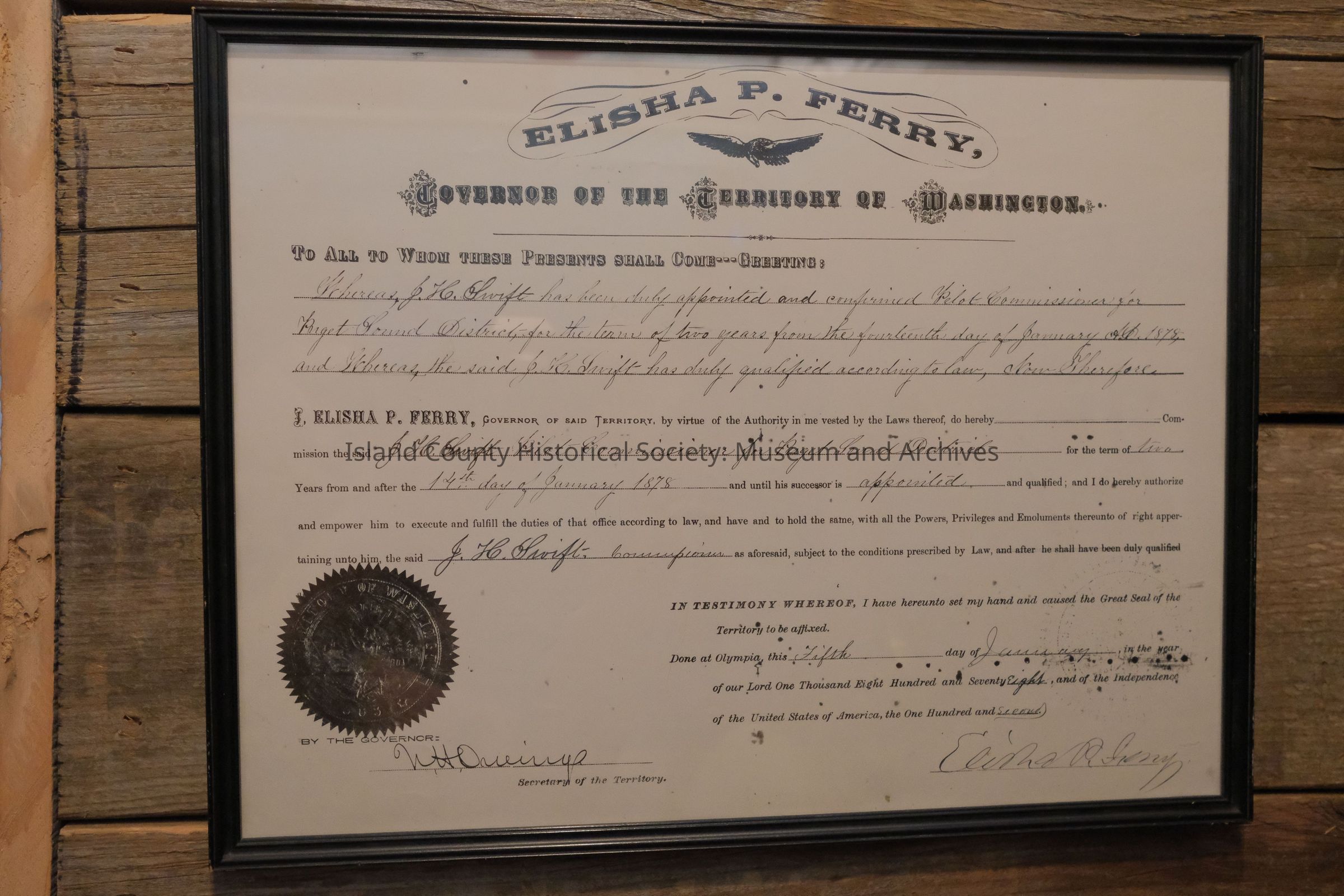 A certificate appointing Captain James Henry Swift as Pilot Commissioner for the Puget Sound District for a two year term beginning January 14, 1878. The appointment was made by Governor Elisha P. Ferry of the Territory of Washington. The document was signed January 5, 1878. The document is signed by the Governor and Secretary of the Territory.Archive Details