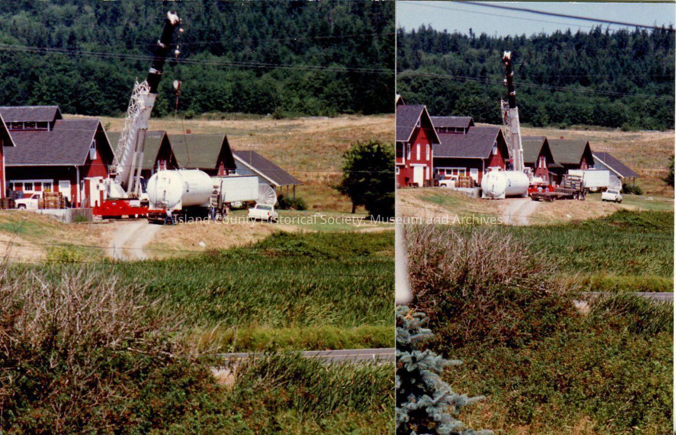 Crane lifts large tank behind barns at Greenbank Loganberry Farm. Digital copy of Kawasaki photo.