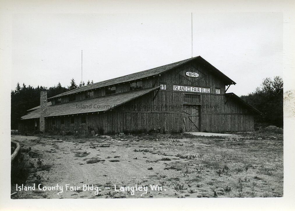The black and white photo shows the Island County Fair building in Langely. The building is in three-quarter view and is surrounded by trees.