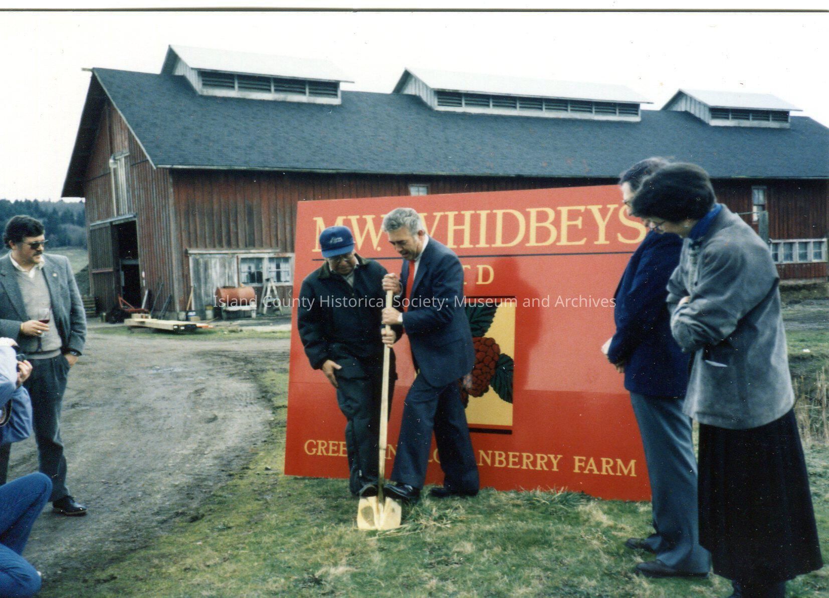 Ste Michelle Loganberry Liqueur production at Greenbank Farm in 1980s. Man uses shovel in groundbreaking ceremony in front of M. W. Whidbeys sign while Mun Kawasaki, farm manager, and others look on. Main barn in background. Digital copy of Kawasaki photo.